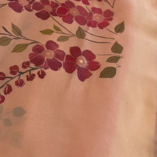 A hand-painted organza silk saree in beige, adorned with maroon buttercup flowers, is a refined blend of delicacy and artistry. Crafted from sheer organza silk, the saree has a light, translucent texture with a subtle crispness and an elegant natural sheen. The soft beige base offers a calm, neutral canvas that enhances the beauty of the artwork.