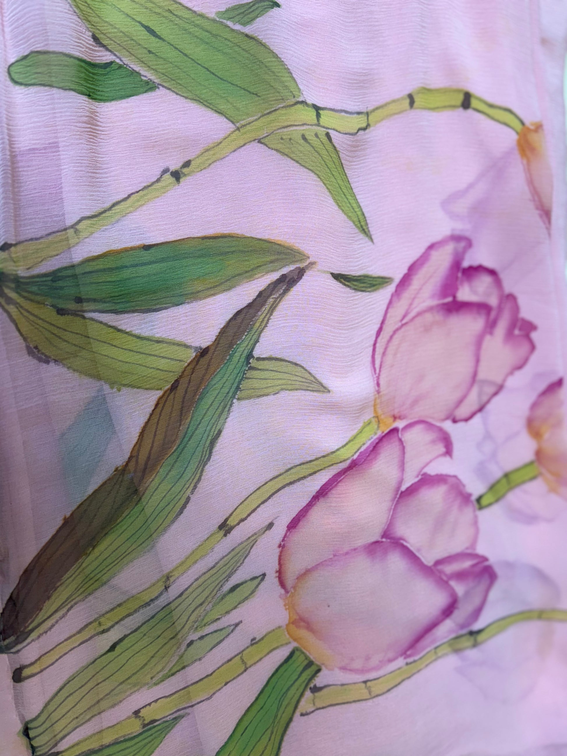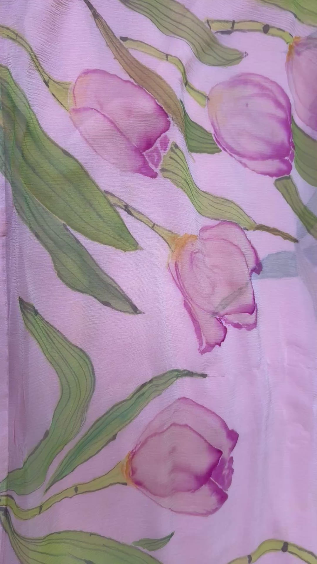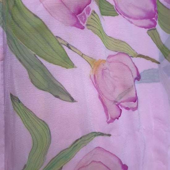 The soft pink tulip motifs, rendered by hand with fine, fluid brushstrokes, appear subtle yet enchanting, almost floating on the translucent fabric. This combination gives the piece a dreamy, ethereal charm and refined handcrafted appeal, making it ideal for daytime events, spring gatherings, or elegant pastel-toned ensembles.