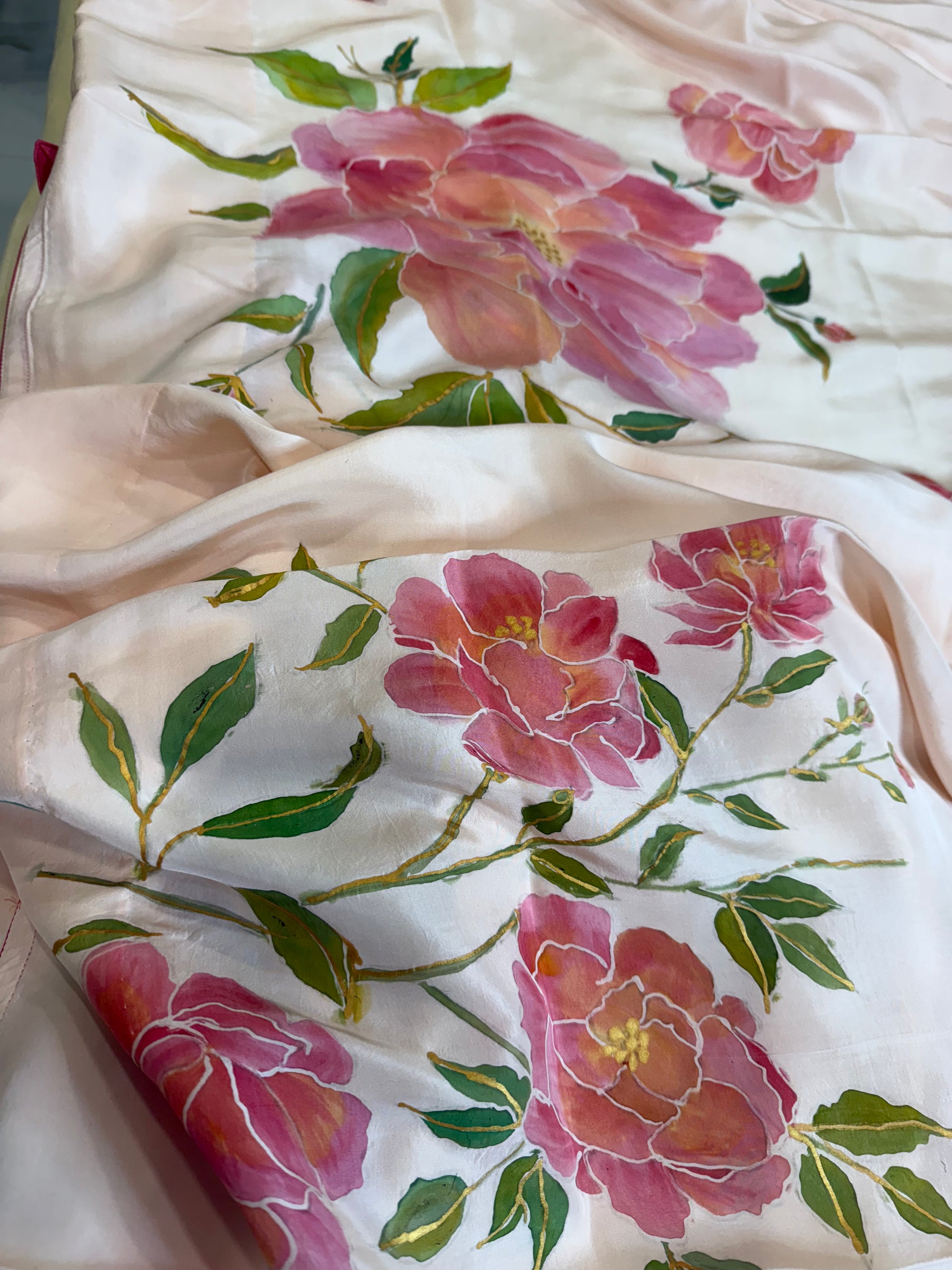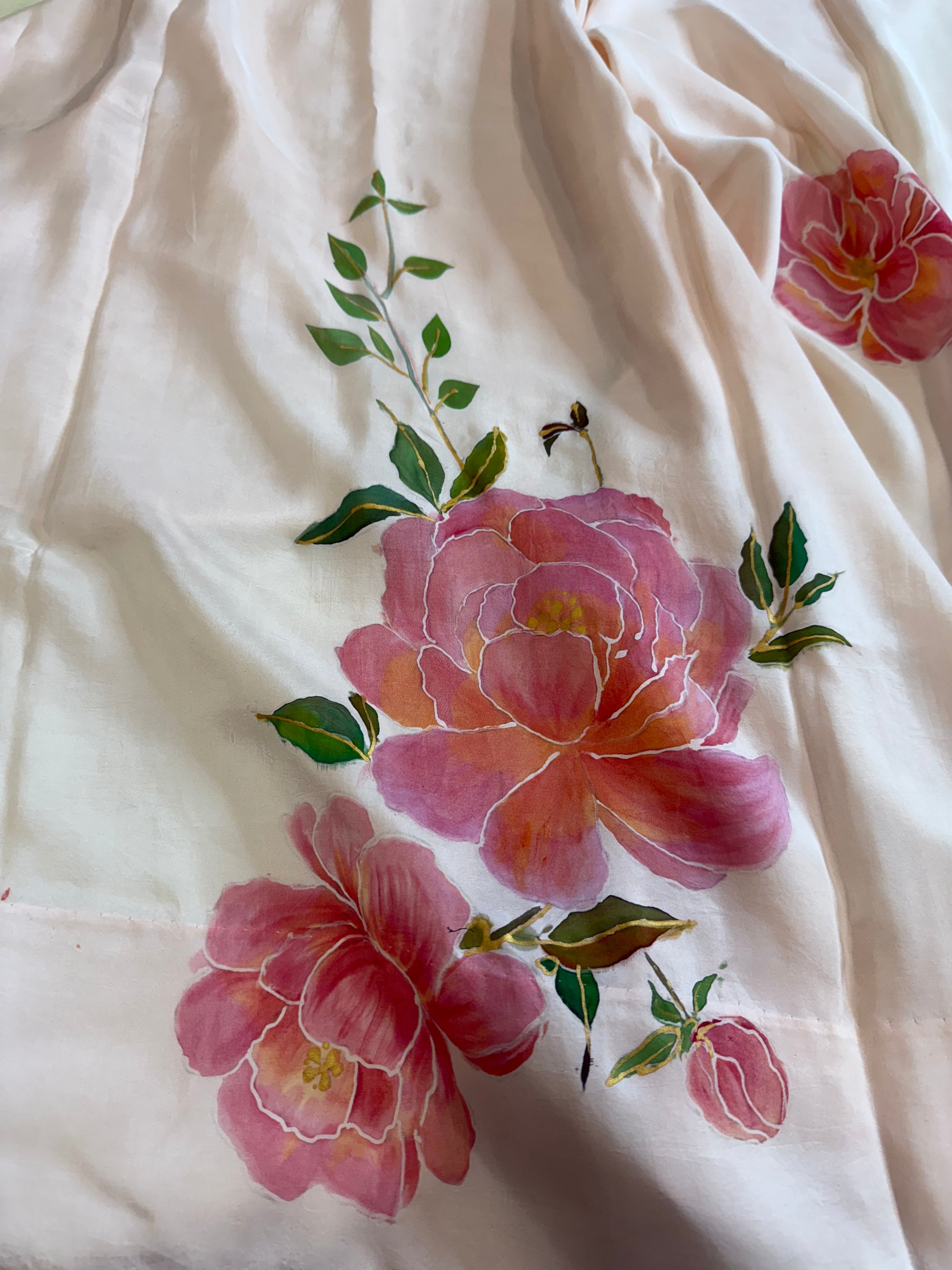 The pink peony motifs, painted by hand with fluid, expressive brushstrokes, appear lush and graceful, symbolizing beauty and refinement. Their subtle contrast against the peach silk gives the piece a harmonious, refined look. This creation exudes feminine charm, handcrafted artistry, and understated luxury.
