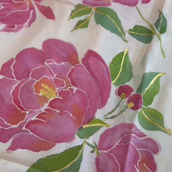 Pink peonies hand-painted on peach habotai silk create a beautifully soft and romantic statement.The peach base offers a warm, delicate backdrop that enhances the floral artwork.