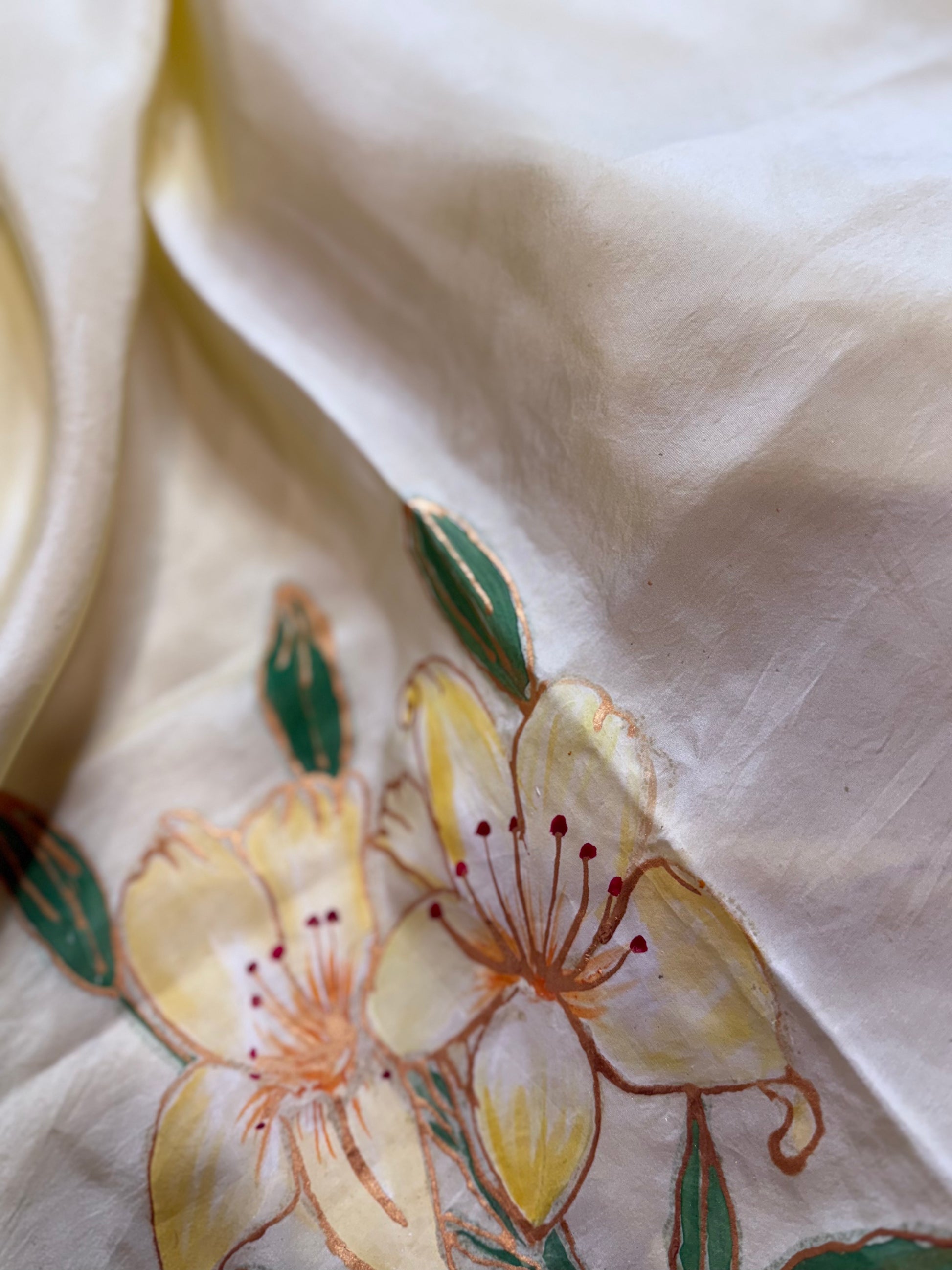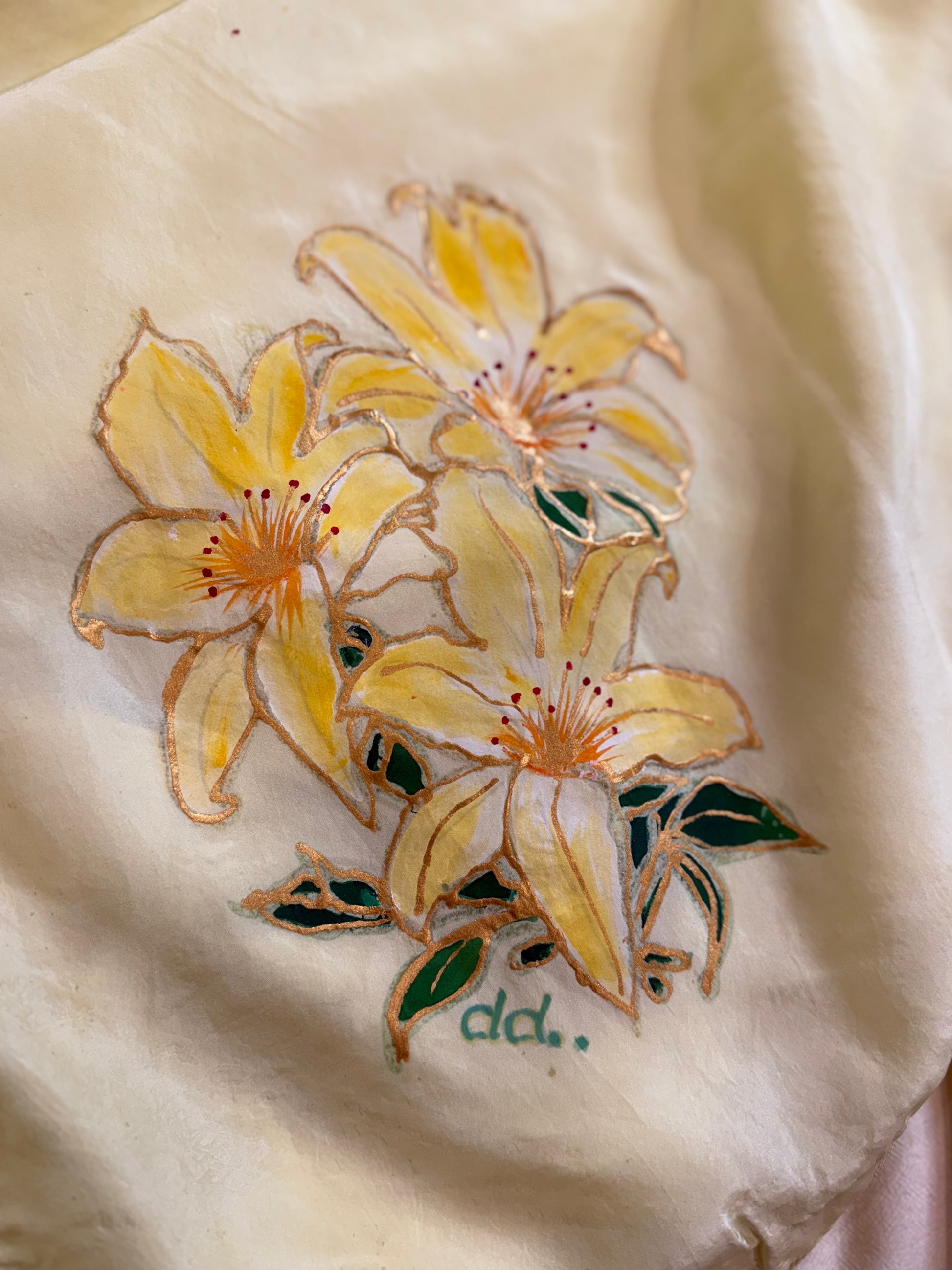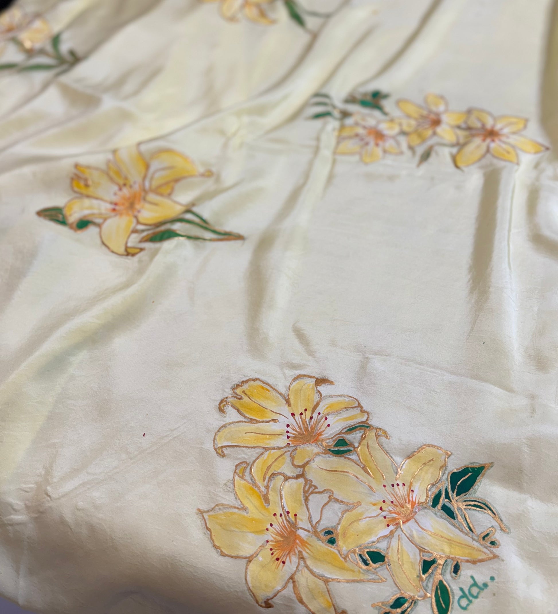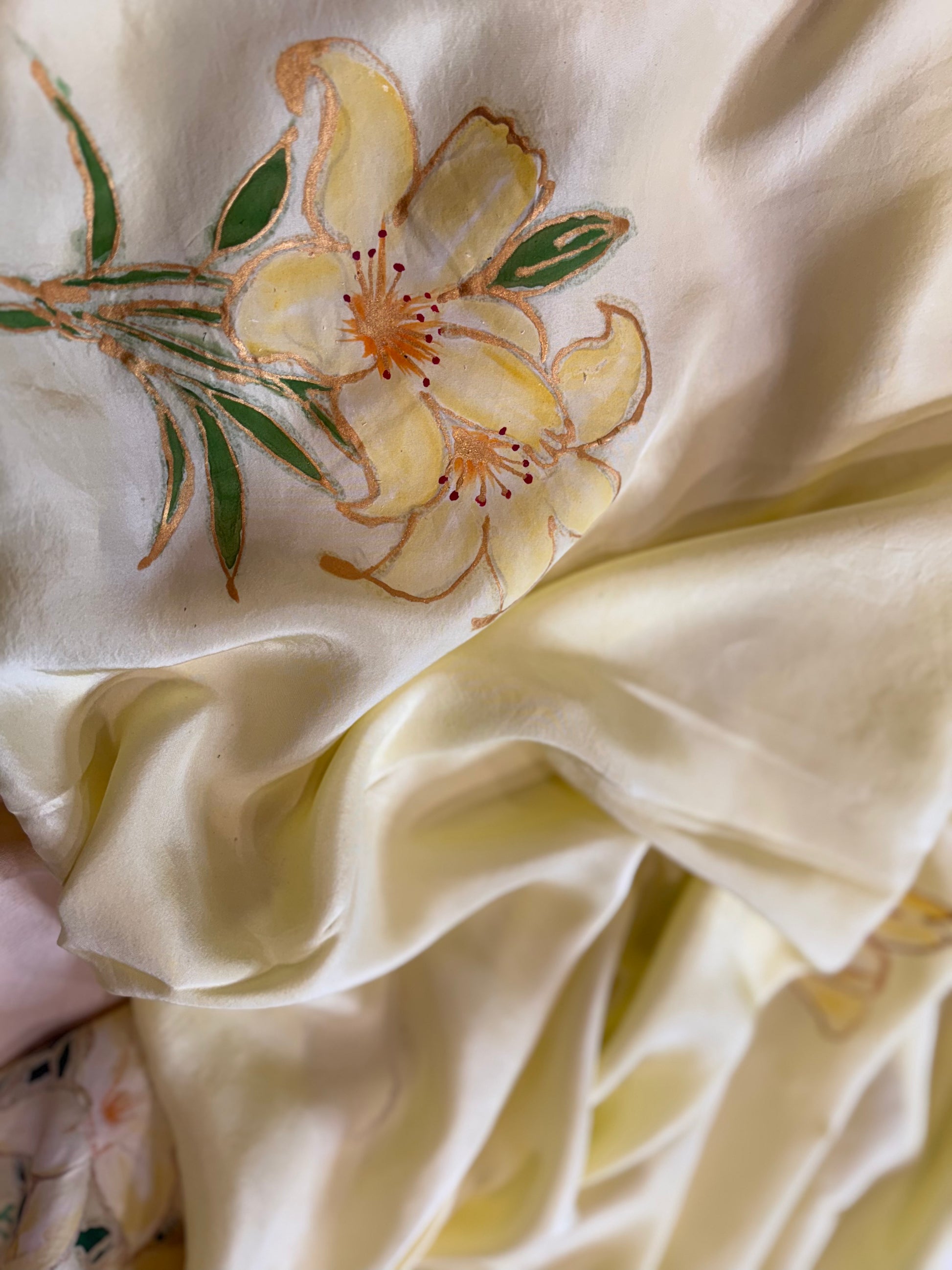 Pale yellow lilies hand-painted on habotai silk create a look of gentle elegance and natural beauty. The habotai silk, lightweight and smooth with a soft natural sheen, provides an airy, flowing base that enhances the delicacy of the artwork.The subtle color of flowers stands out softly against the silk, giving the fabric a serene, refined charm.