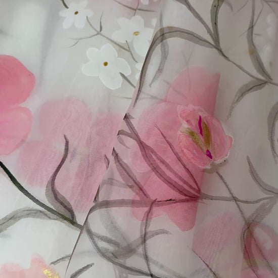 Elevate your ethnic wardrobe with this ethereal white organza dupatta, hand-painted with delicate pink and white florals. The sheer, lightweight fabric drapes beautifully while the intricate floral detailing adds understated elegance. Perfect for festivals, weddings, or everyday sophistication—a timeless piece that seamlessly transitions from traditional to contemporary styling.