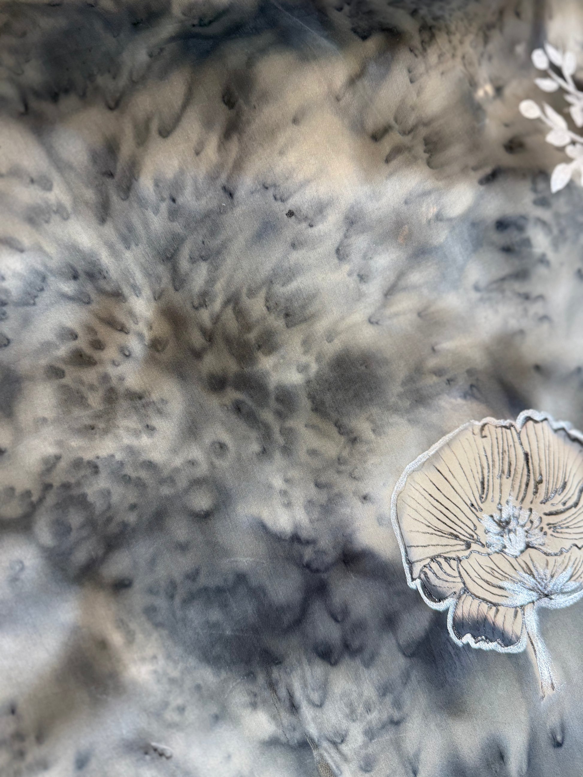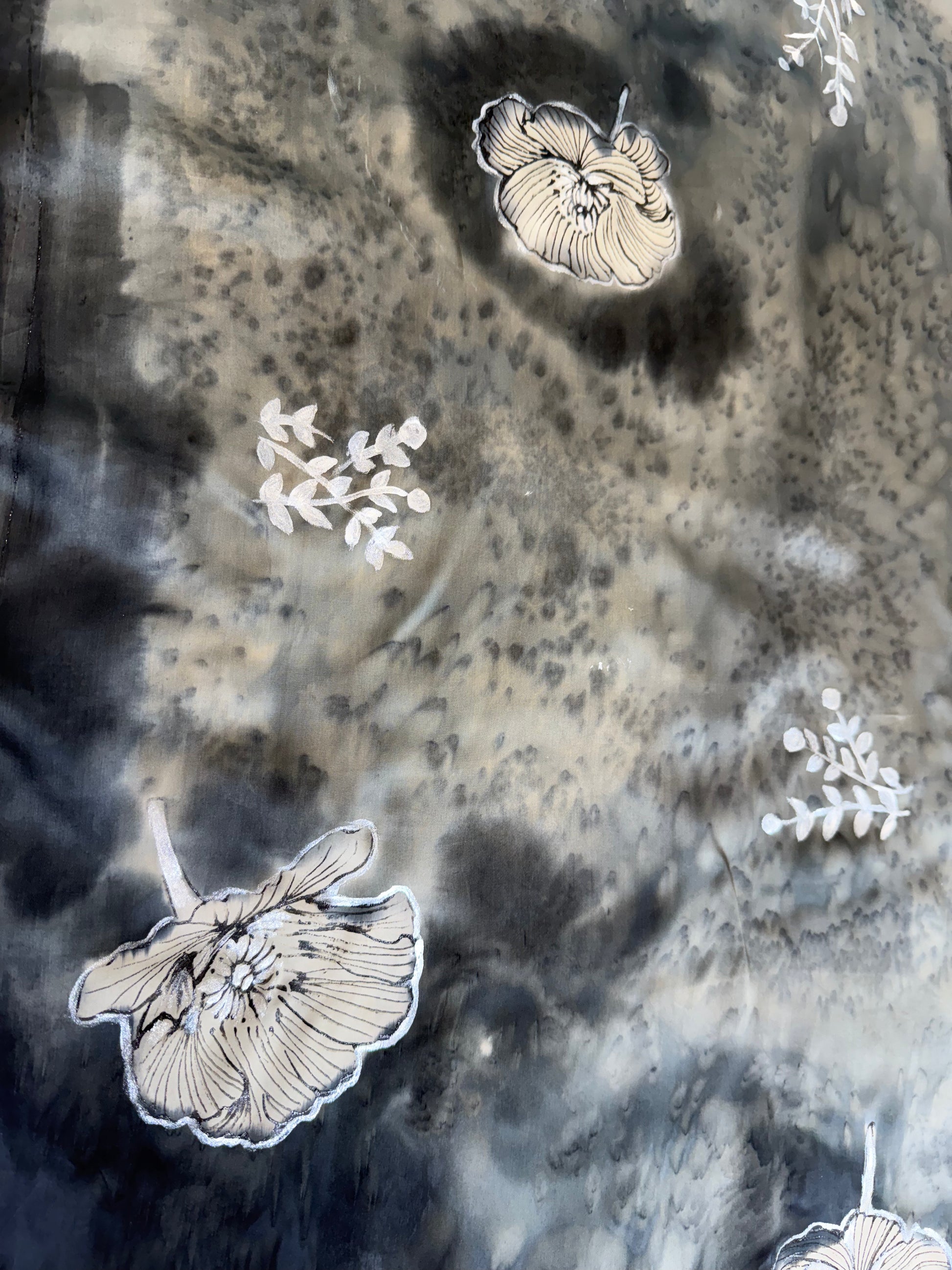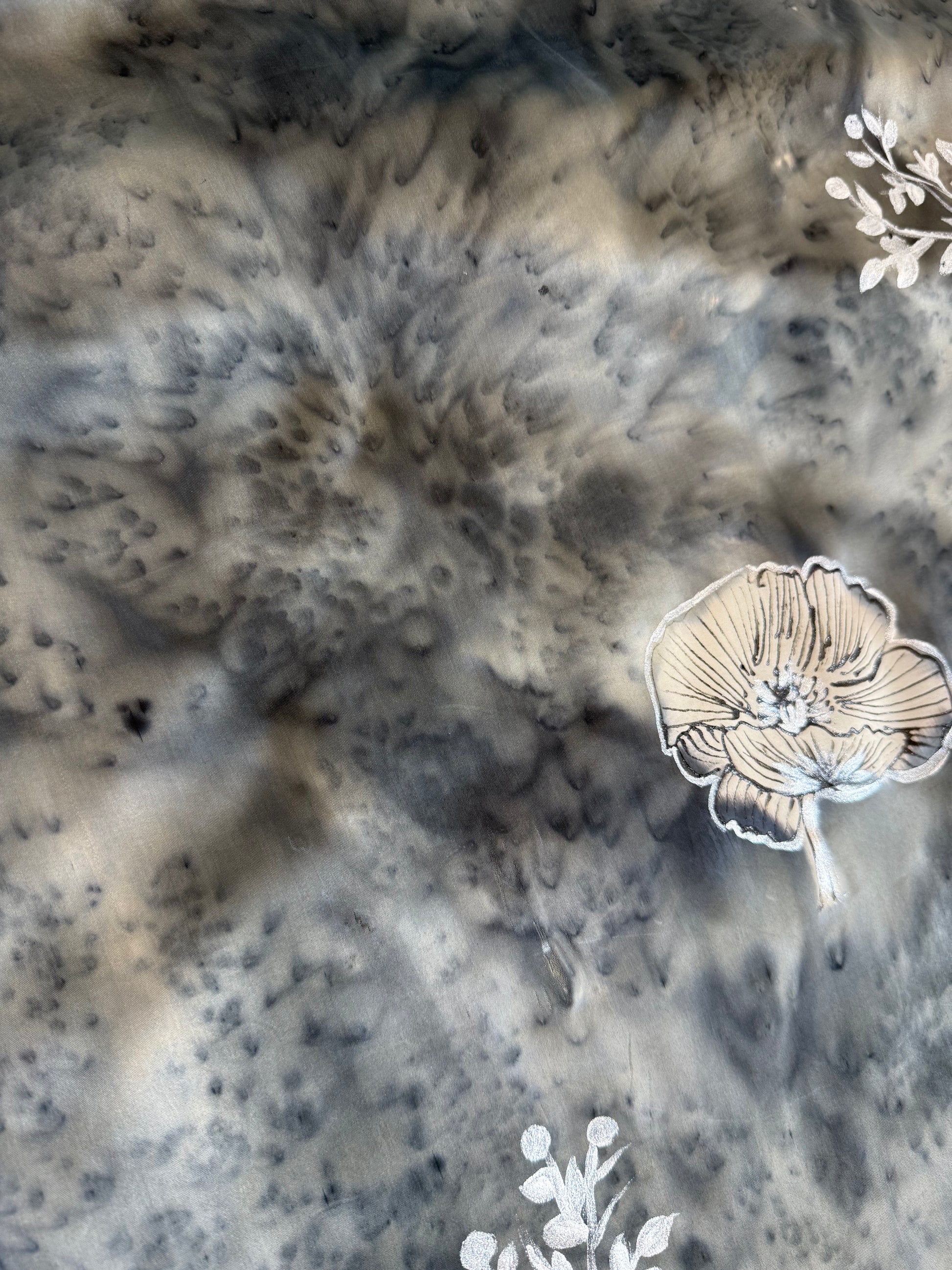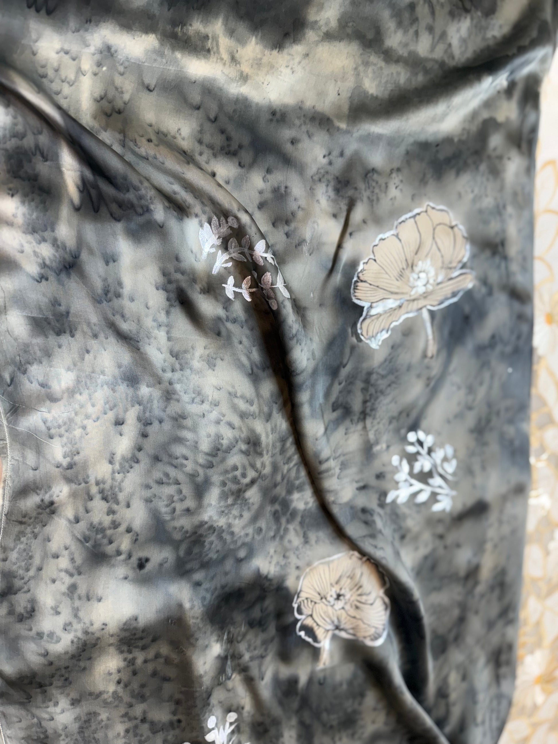 A hand-painted stole featuring white pansies on a greyish-black background is a striking blend of elegance and artistry. The deep grey-black base creates a dramatic, contemporary backdrop that enhances the visual impact of the design.