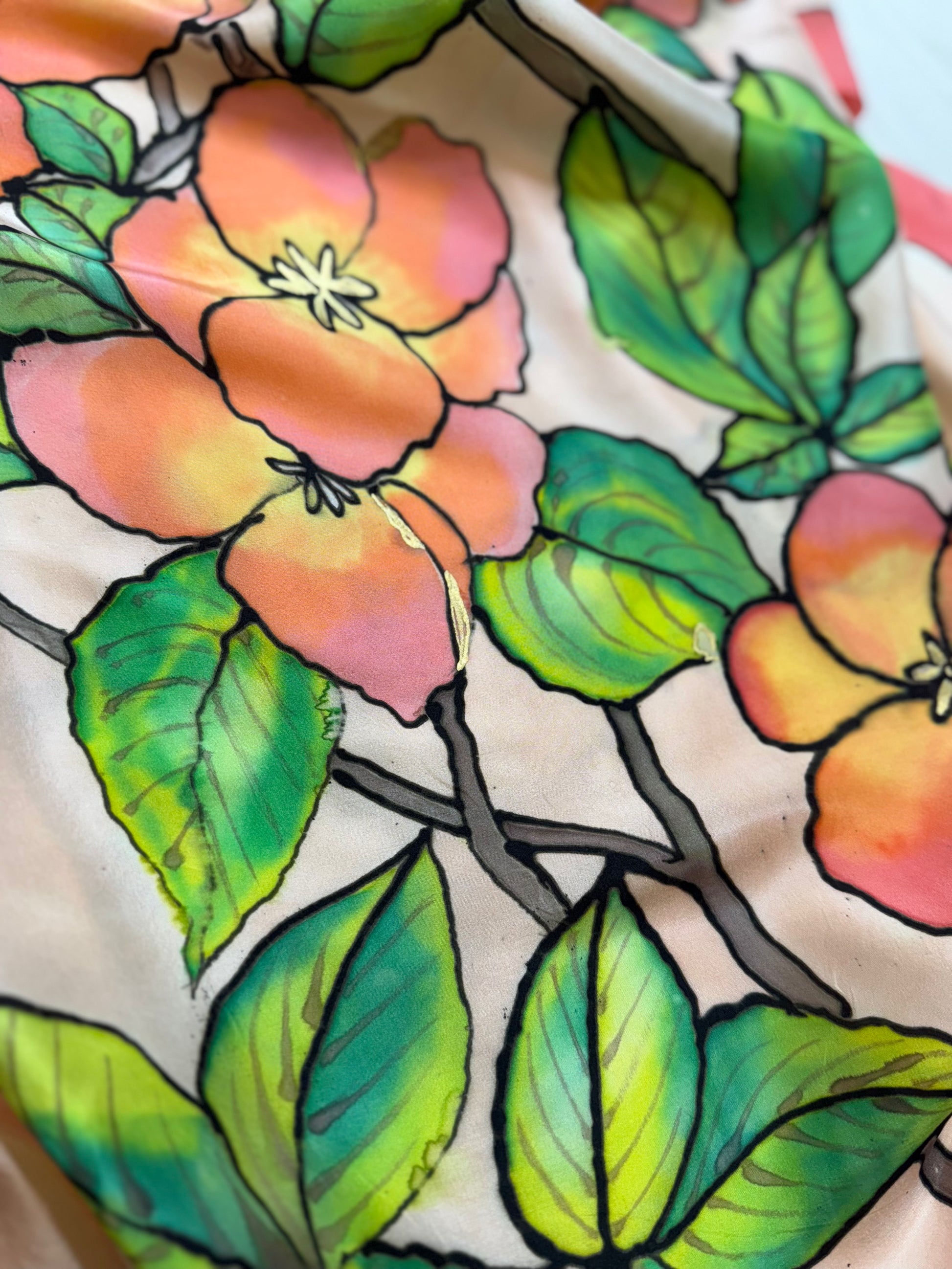 A peach habotai silk dupatta with blooming flowers of spring is a soft, graceful expression of seasonal elegance. Made from habotai silk, it has a lightweight, smooth texture with a gentle natural sheen and an effortless drape. The peach hue feels warm and delicate, lending a subtle glow to the overall look